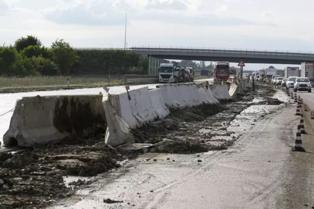 | Queues de camions et de voitures sur une autoroute endommagée par les pluies torrentielles près de Forlí, le 18 mai. |
