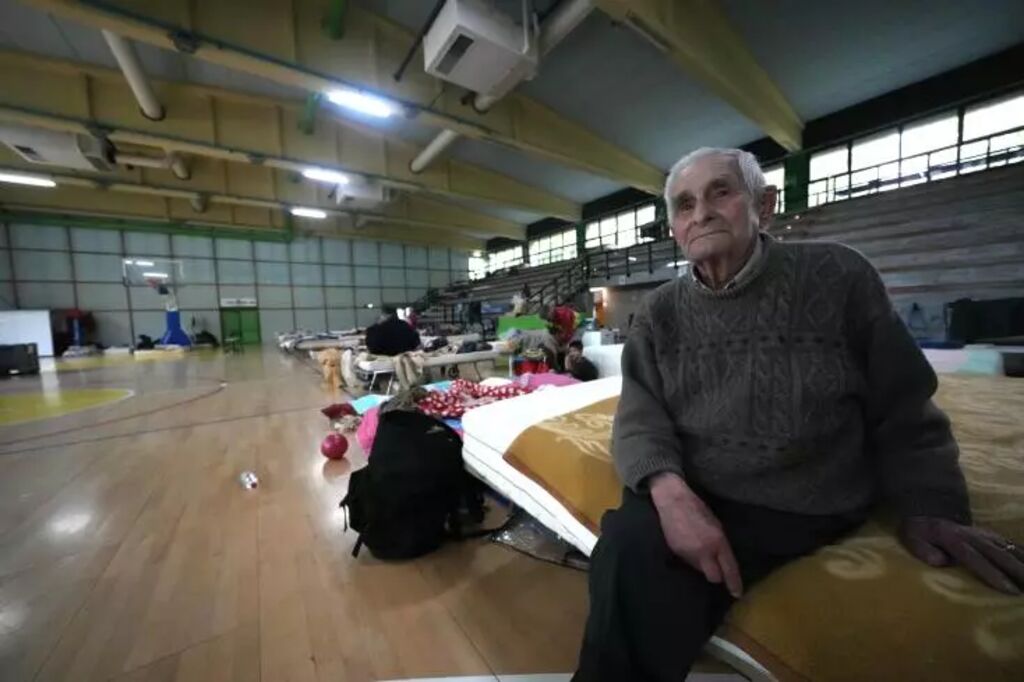 | Un homme se repose dans un gymnase, évacué de chez lui à cause des inondations, à Castel Bolognese le 18 mai. |