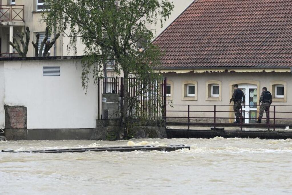 | La gendarmerie dans les rues de Boulay-Moselle inondée, en Moselle, le 17 mai 2024. |