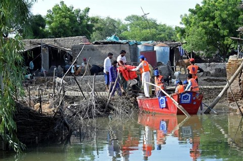 | Des volontaires de la Fondation Al-Khidmat distribuent en bateau de l'aide à des personnes sinistrées de Sukkur, dans la province pakistanaise de Sindh, le 31 août. |