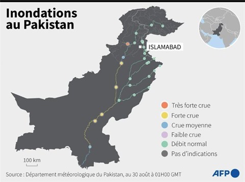 | Carte du Pakistan montrant le débit de certaines rivières du pays, au 30 août à 01h00 GMT. |