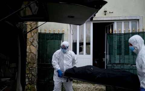 | Des employés des pompes funèbres transportent le corps d'une personne décédée du COVID-19 à Casal de Cambra, le 29 janvier au Portugal. |