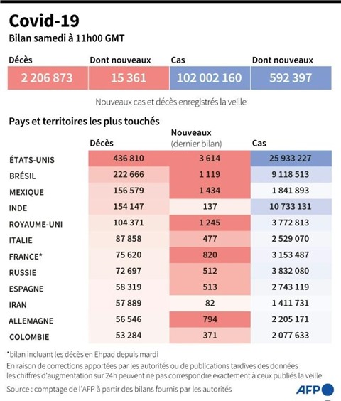 La pandémie a fait plus de 2,2 millions de morts dans le monde depuis fin décembre 2019, selon un bilan établi par l'AFP samedi 30 janvier à partir de sources officielles.