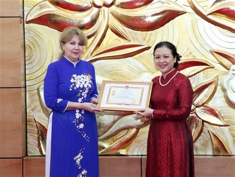 | La présidente de l'Union des organisations d’amitié du Vietnam, Nguyên Phuong Nga (droite), remet l’insigne "Pour la paix et l'amitié entre les nations" à l'ambassadrice d'Arménie au Vietnam, Raisa Vardanyan. |