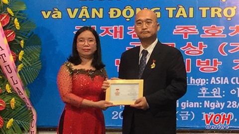 | Remise d'insigne au consul chargé du domaine non gouvernemental, de la culture et de l’éducation du consulat général de la République de Corée à Hô Chi Minh-Ville, Kim Jea Chon, le 28 juillet dans la mégapole du Sud. |