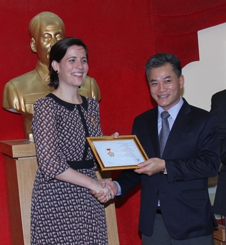 | Le vice-président et secrétaire général de l'UOAV, Don Tuân Phong, a remis l'insigne "Pour la paix et l'amitié entre les peuples" à Mme l'ambassadeur de Hongrie au Vietnam, Torda Eszter. |
