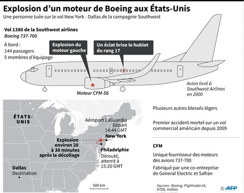 Les premiers éléments de l'enquête ont montré que des éclats de métal avaient brisé un hublot, blessant mortellement une mère de famille de 43 ans, happée partiellement à l'extérieur de l'appareil, et semant la panique en cabine.