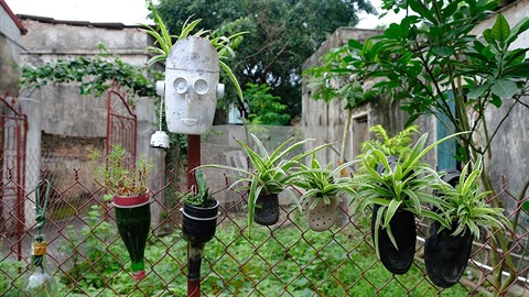 | Dans cette scène miniature en plein air, Dinh Dông Giang fait se rencontrer objets recyclés et plantes vertes. |