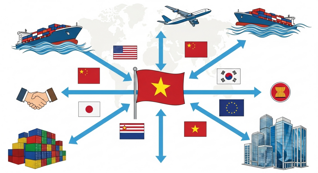 L’intégration économique internationale profonde du Vietnam peut être illustrée dès 1995, année où le pays a déposé sa demande d’adhésion à l’Organisation mondiale du commerce (OMC) et est devenu officiellement membre de l’Association des nations d’Asie du Sud-Est (ASEAN). En 2025, le Vietnam entretient des relations commerciales avec plus de 230 pays et territoires.