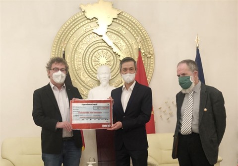 | Le président du Parti communiste allemand, Patrik Köbele (gauche), remet le 25 novembre une aide financière à l’ambassadeur du Vietnam en Allemagne, Nguyên Minh Vu (droite). |