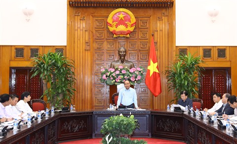 | Le Premier ministre Nguyên Xuân Phuc (debout) lors de la séance de travail du 26 octobre avec quatre provinces gravement touchées par les dernières intempéries. |