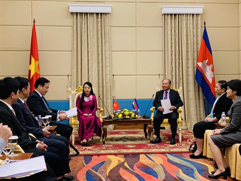 | La ministre Nguyên Thi Kim Tiên et son homologue cambodgien Mam Bunheng. |