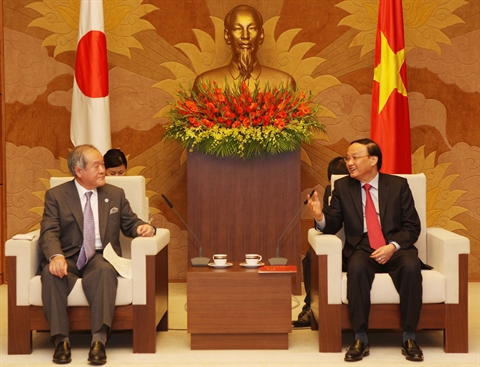| Le chef de la Commission centrale d'organisation du PCV et le président du groupe des députés d'amitié Vietnam-Japon, Tô Huy Rua (droite) et le chef de la délégation parlementaire japonais Shunichi Suzuki, le 31 mars à Hanoi. |