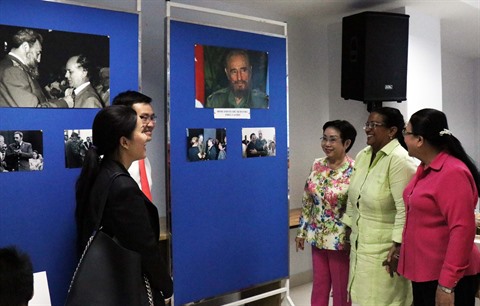 | Indira Lopez Arguelles, consule générale de Cuba à Hô Chi Minh-Ville (2e, droite) en visite à l'exposition de photos sur le président Fidel Castro avec le Vietnam. |