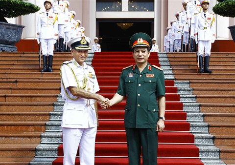 | Le vice-ministre de la Défense et chef de l'état-major général de l'Armée populaire du Vietnam, Phan Van Giang (droite), et le président indien du Comité des chefs d'état-major, le commandant de l’armée navale et l’amiral Sunil Lanba, le 3 octobre à Hanoï. |