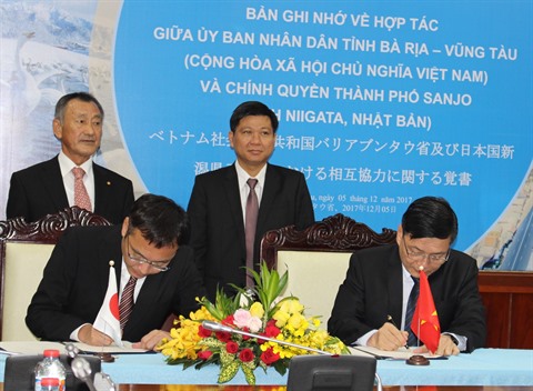 | Signature du protocole d'accord sur le renforcement des échanges et du partenariat entre la province vietnamienne de Bà Ria-Vung Tàu et la ville japonaise de Sanjo, le 5 décembre dans cette province du Sud. |