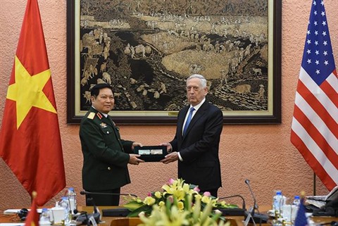 | Le ministre vietnamien de la Défense, Ngô Xuân Lich (gauche), et le secrétaire d’État américain à la Défense, James Mattis. |