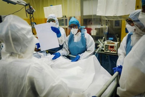 | Équipe médicale autour d'un malade du COVID-19 en soins intensifs, le 9 avril à l'Hôpital franco-britannique de Levallois-Perret. |
