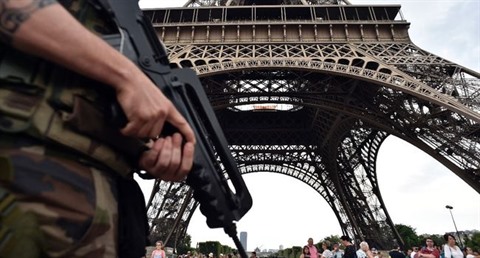 | Un soldat de l'opération sentinelle près de la tour Eiffel à Paris. |