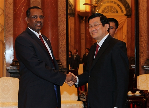| Le président Truong Tân Sang (droite) et le président de l’Assemblée nationale du Soudan, Al Fatih Izzeldin Al Mansour, le 29 mars à Hanoi. |