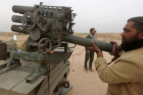 | Des combattants chiites irakiens lancent des roquettes contre le groupe État islamique à Tikrit le 12 mars. |