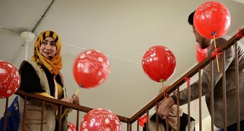 | Une membre de l'association Génération Renaissance distribue des ballons pour la Saint-Valentin dans une école à Mossoul, le 14 février |