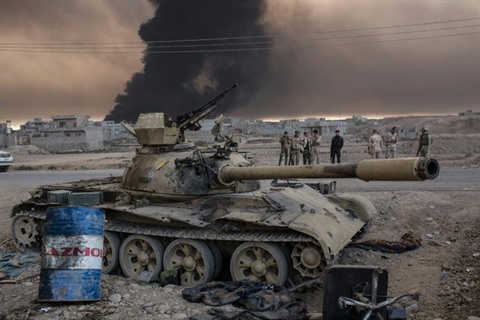 | Des soldats irakiens devant l'épave d'un tank dans les environs de Qayyarah, à 60 km au sud de Mossoul, le 19 octobre. |