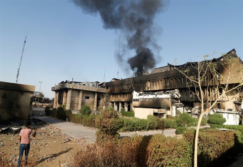 | De la fumée s'élève le 7 septembre du siège du gouvernorat provincial à Bassora incendié ces derniers jours lors de manifestations. |