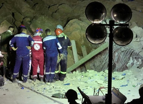| Des secouristes sur les lieux de l'effondrement d'un sanctuaire chiite, le 21 août à Kerbala, en Irak. |