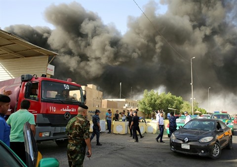 | Des pompiers en action pour éteindre les flammes qui ont ravagé le plus grand dépôt de bulletins de vote d'Irak, le 10 juin à Bagdad. |