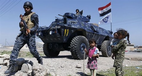 | Des enfants irakiens observent des membres des forces de sécurité à Mossoul, le 27 mars. |