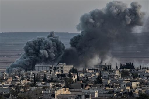 | Une colonne de fumée s'élève de la ville syrienne de Kobané, après une frappe aérienne américaine, le 9 novembre |