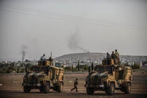 | Des forces turques stationnées le 3 octobre près de la ville de Kobané d'où s'élève de la fumée |