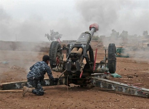 | Un soldat irakien tire sur une position de l'EI, à Abu Saif, au sud de Mossoul, le 1er décembre. |
