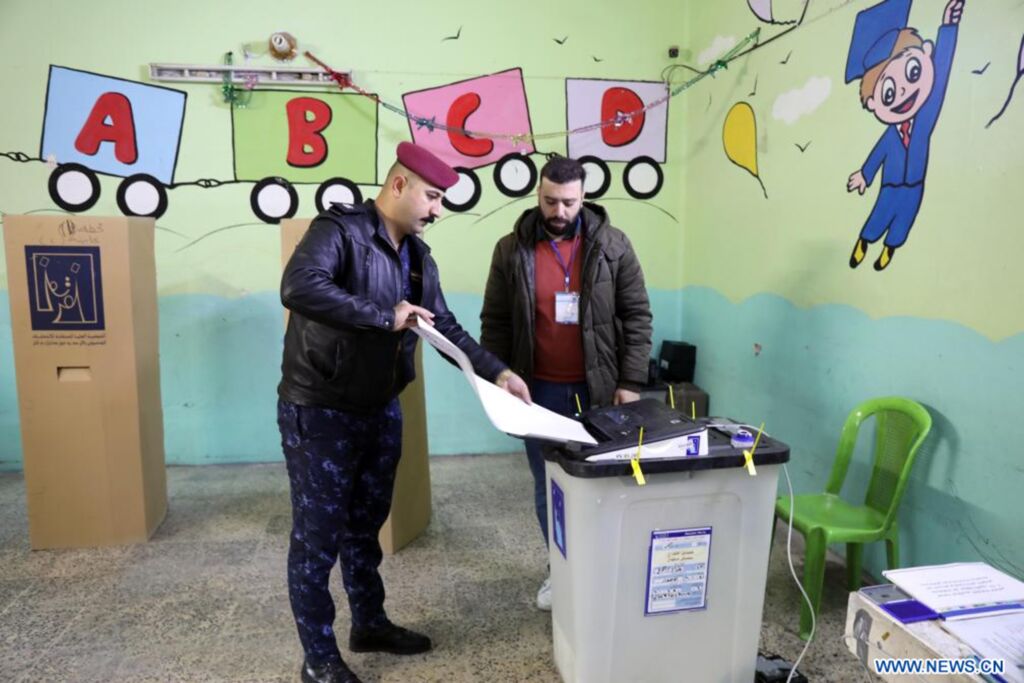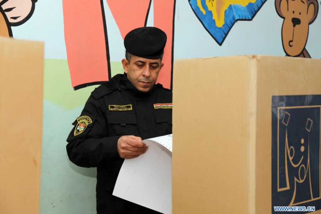 | Photo prise le samedi 16 décembre 2023 montrant un membre des forces de sécurité irakiennes en train de voter pour les élections provinciales à Bagdad, en Irak. |