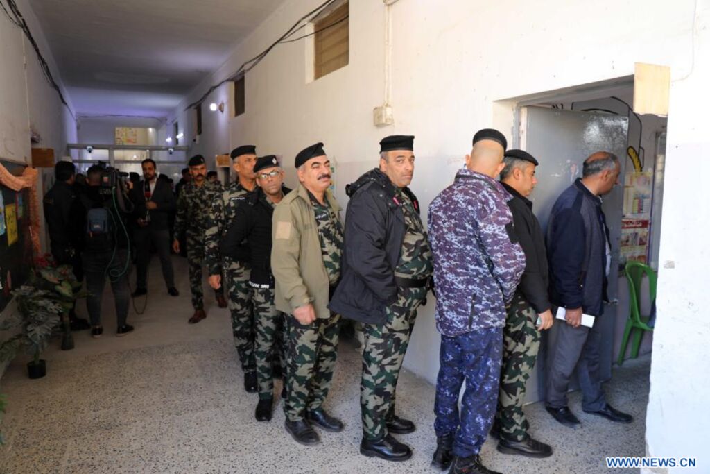 | Des membres des forces de sécurité irakiennes font la queue pour voter dans les élections provinciales à Bagdad, en Irak, le samedi 16 décembre 2023. |