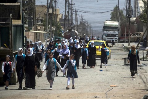 | Des jeunes Irakiennes reviennent de l'école, le 12 juillet à Mossoul-ouest. |