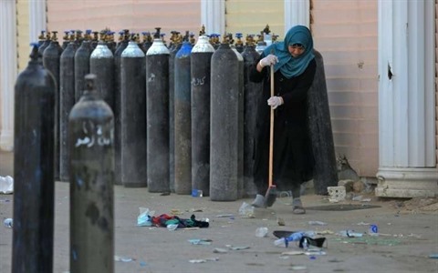 | Une Irakienne balaie des débris devant des bouteilles d'oxygène à l'extérieur de l'hôpital Ibn al-Khatib à Bagdad, où un incendie meurtrier s'est produit, le 25 avril. |