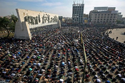 | Des partisans de Moqtada Sadr rassemblés pour la grande prière sur la place Tahrir, le 27 novembre. |