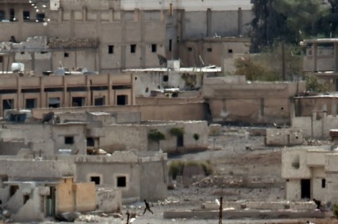 | Des militants de l'EI se mettent à l'abri après une frappe de la coalition internationale à Kobané, le 15 octobre 2014. |