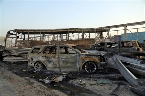 | Des véhicules calcinés dans une double attaque de l'EI, le 14 septembre en Irak. |