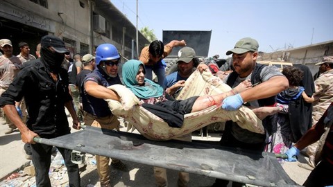 | Des membres des forces de sécurité irakiennes transportent une femme blessée lorsqu'un kamikaze s'est fait exploser, le 23 juin à Mossoul. |