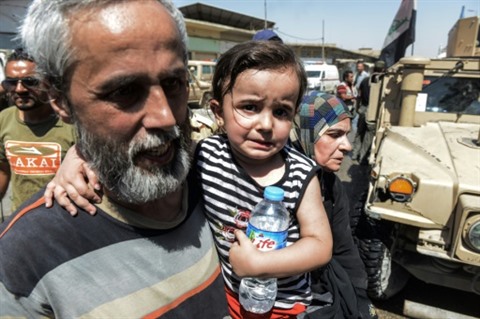 | Des civils fuyant la vieille ville de Mossoul et les combats entre forces armées irakiennes et jihadistes de l'EI, le 23 juin. |