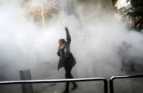 | Une Iranienne dans la fumée de gaz lacrymogène lors de manifestations à l'Université de Téhéran, le 30 décembre 2017. |