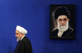 | Le président iranien Hassan Rohani à côté d'un portrait du guide suprême, l'ayatollah Ali Khamenei, le 16 février à Téhéran. |