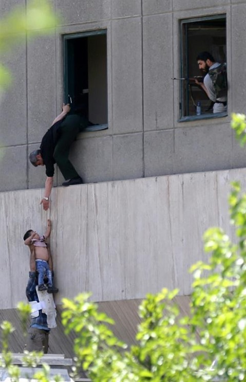 | Des policiers iraniens évacuent un enfant du Parlement à Téhéran lors d'une attaque qui a fait au moins 12 morts, revendiquée par le groupe jihadiste État islamique, le 7 juin. |