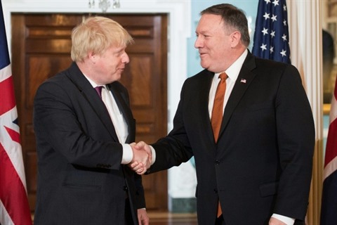 | Le secrétaire d'État américain Mike Pompeo serrant la main à son homologue britannique Boris Johnson à Washington le 7 mai. |