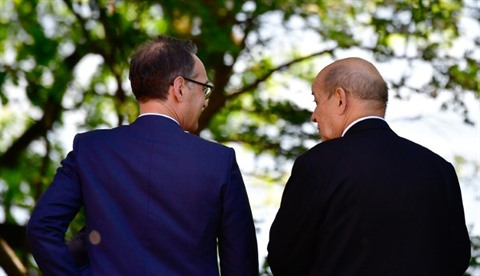 | Le ministre allemand des Affaires étrangères Heiko Maas (gauche) et son homologue français Jean-Yves Le Drian, le 7 mai à Berlin. |