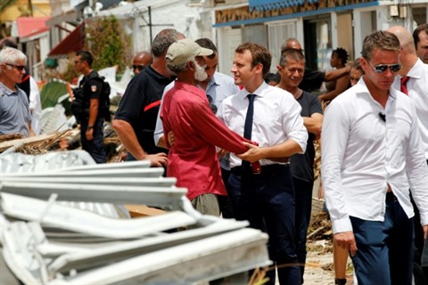 | Le président français Emmanuel Macron au milieu des décombres après le passage de l'ouragan Irma à Saint-Martin, le 12 septembre. |