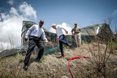 | Le roi des Pays-Bas Willem-Alexander, accompagné du ministre néerlandais de l'Intérieur Ronald Plasterk, sur le côté néerlandais de l'île de Saint-Martin (Sint Maarten), le 11 septembre. |